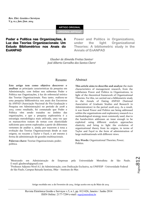 SANTOS, G. A. F.; CLARO, J. A. C. S. Poder e Política nas Organizações, à Luz das Teorias Organizacionais: Um Estudo Bibliométrico nos Anais do EnANPAD. Rev. Elet. Gestão e Serviços, v. 5, n. 1, p. 812–826, 2014.
