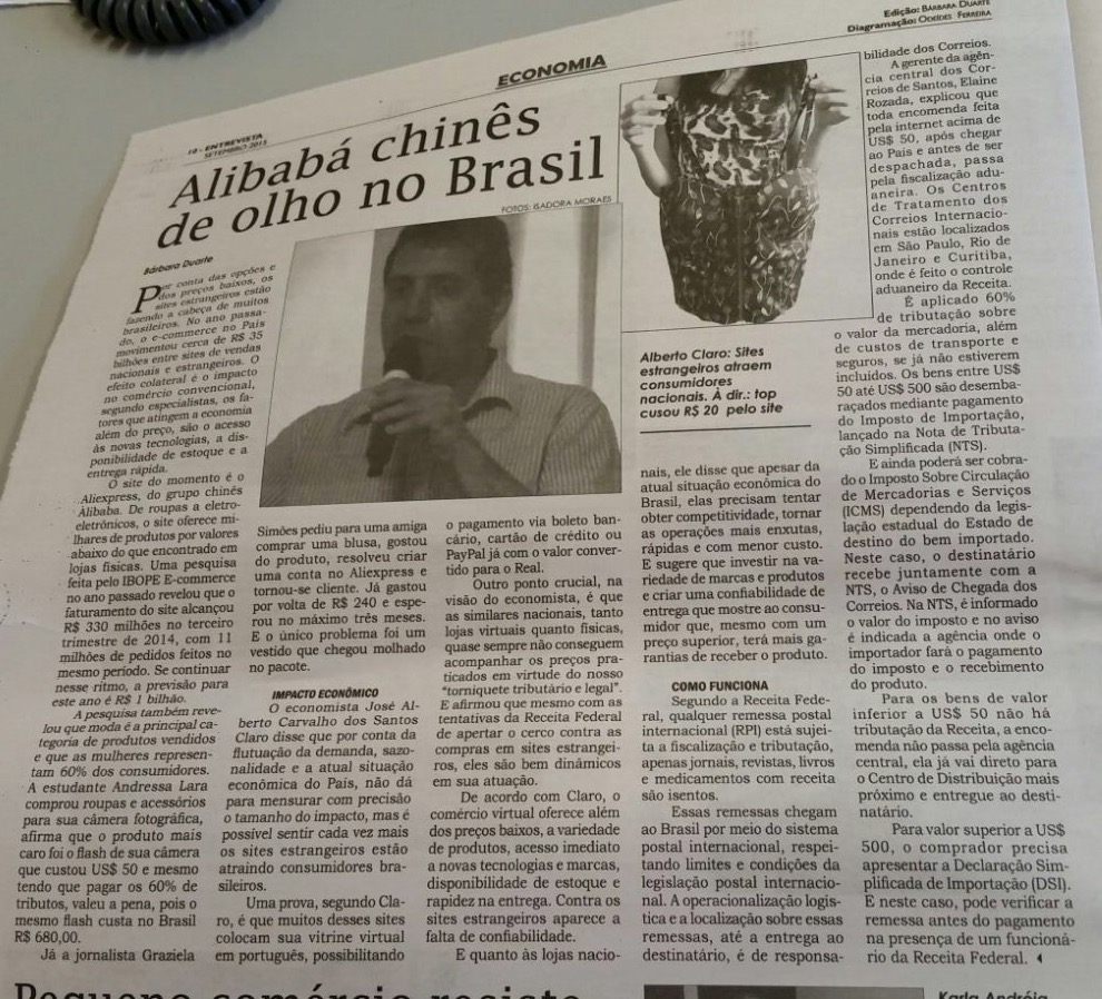 Saiu no Jornal Entrevista (do curso de Jornalismo da UniSantos) o meu depoimento, como pesquisador do tema, sobre os portais de comércio eletrônico estrangeiros que atuam no Brasil. Parabéns à Bárbara Duarte pelo texto.