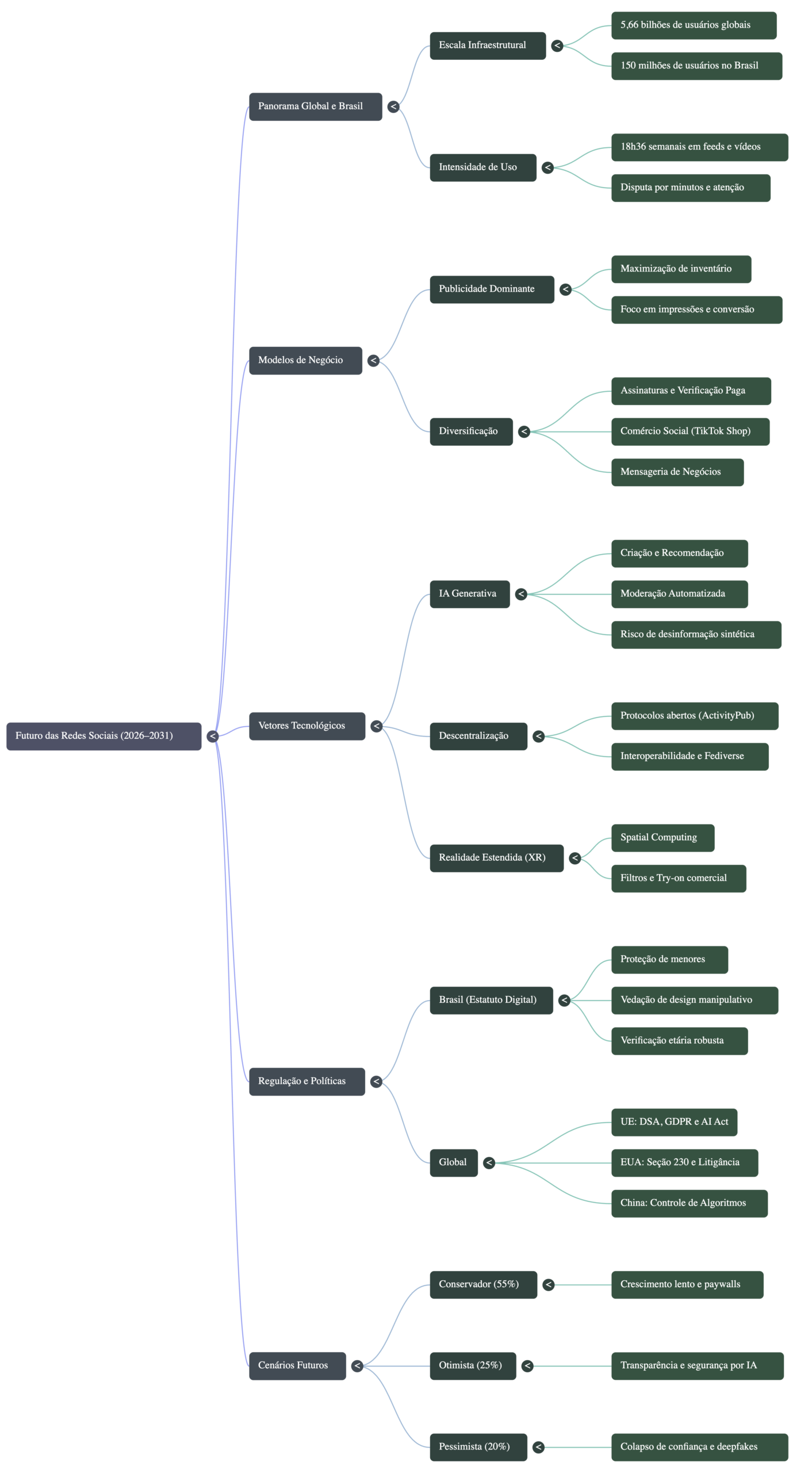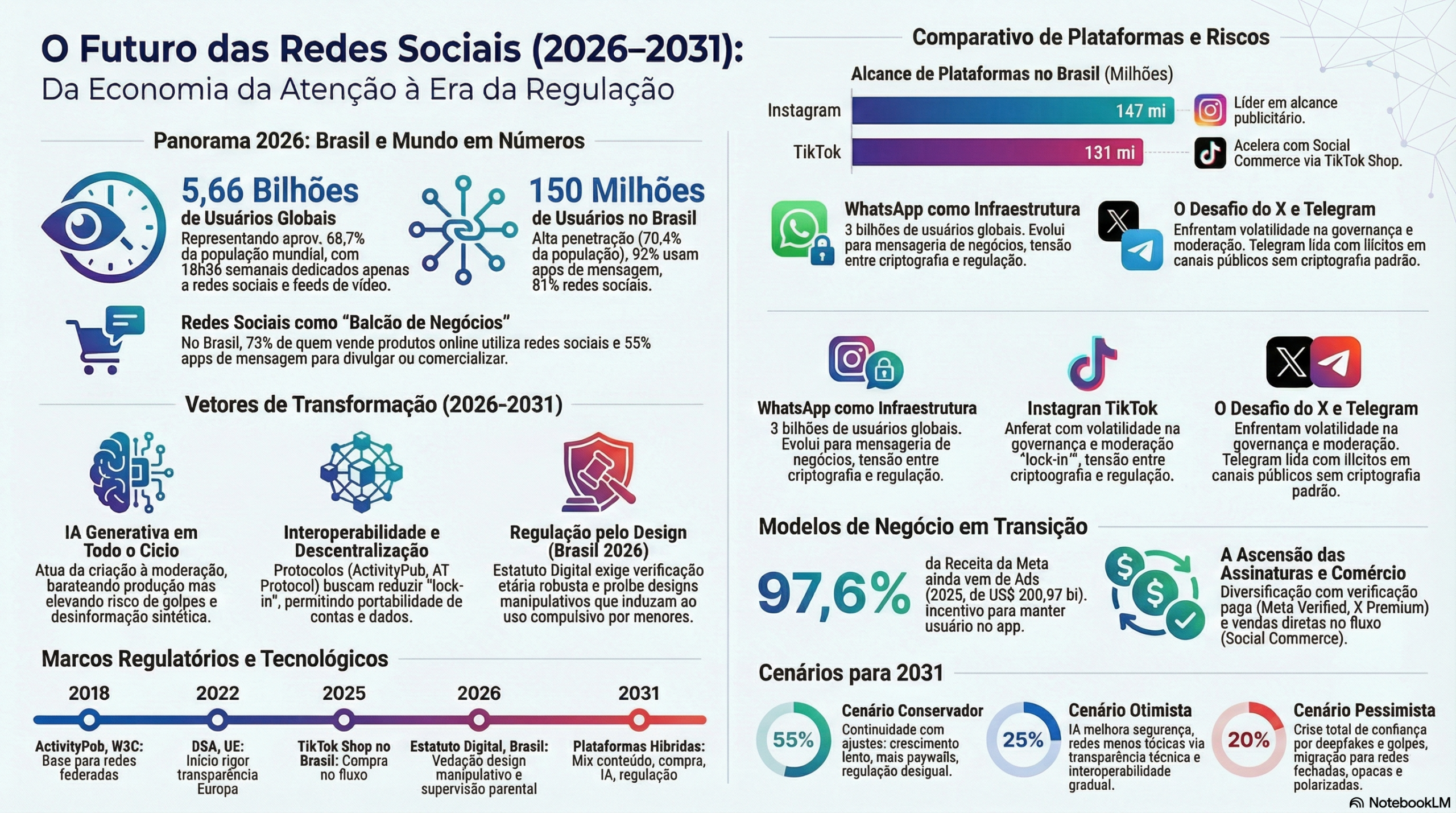 - Pessimista (20%): O surgimento da “Social Splinternet”. O colapso da confiança devido a deepfakes e golpes em escala destrói a credibilidade das grandes redes. O resultado é uma migração em massa para comunidades fechadas, criptografadas e altamente polarizadas, onde a fragmentação regulatória entre blocos geopolíticos impede qualquer governança global.