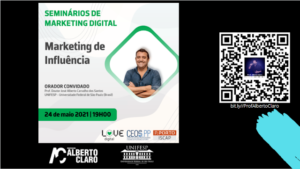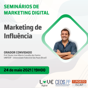 Dentro do programa de Seminários de Marketing Digital, do Instituto Superior de Contabilidade e Administração do Porto, Portugal (ISCAP), no dia 24 de maio de 2021, ministrei um seminário online subordinado ao tema “Marketing de Influência”, inserido no âmbito da unidade curricular de Social Media Marketing, do Mestrado em Marketing Digital, a convite do Prof. Dr. Jorge Remondes.